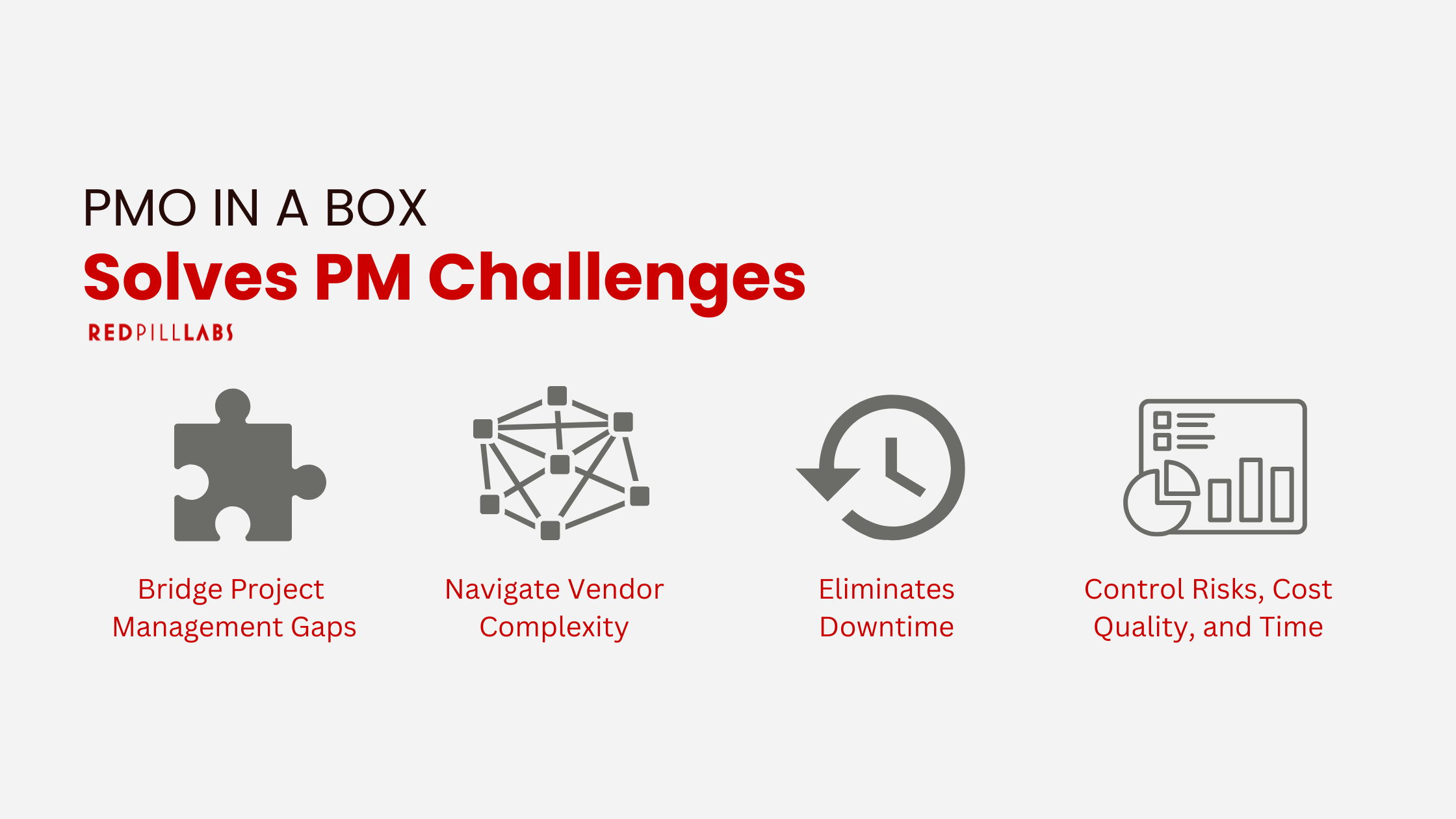 Red Pill Labs' PMO in a Box methodology transforms complex, high-risk technology projects into controlled, predictable successes. We bring the expertise, the methodologies, and the accountability—so you can focus on what matters most: running your business.