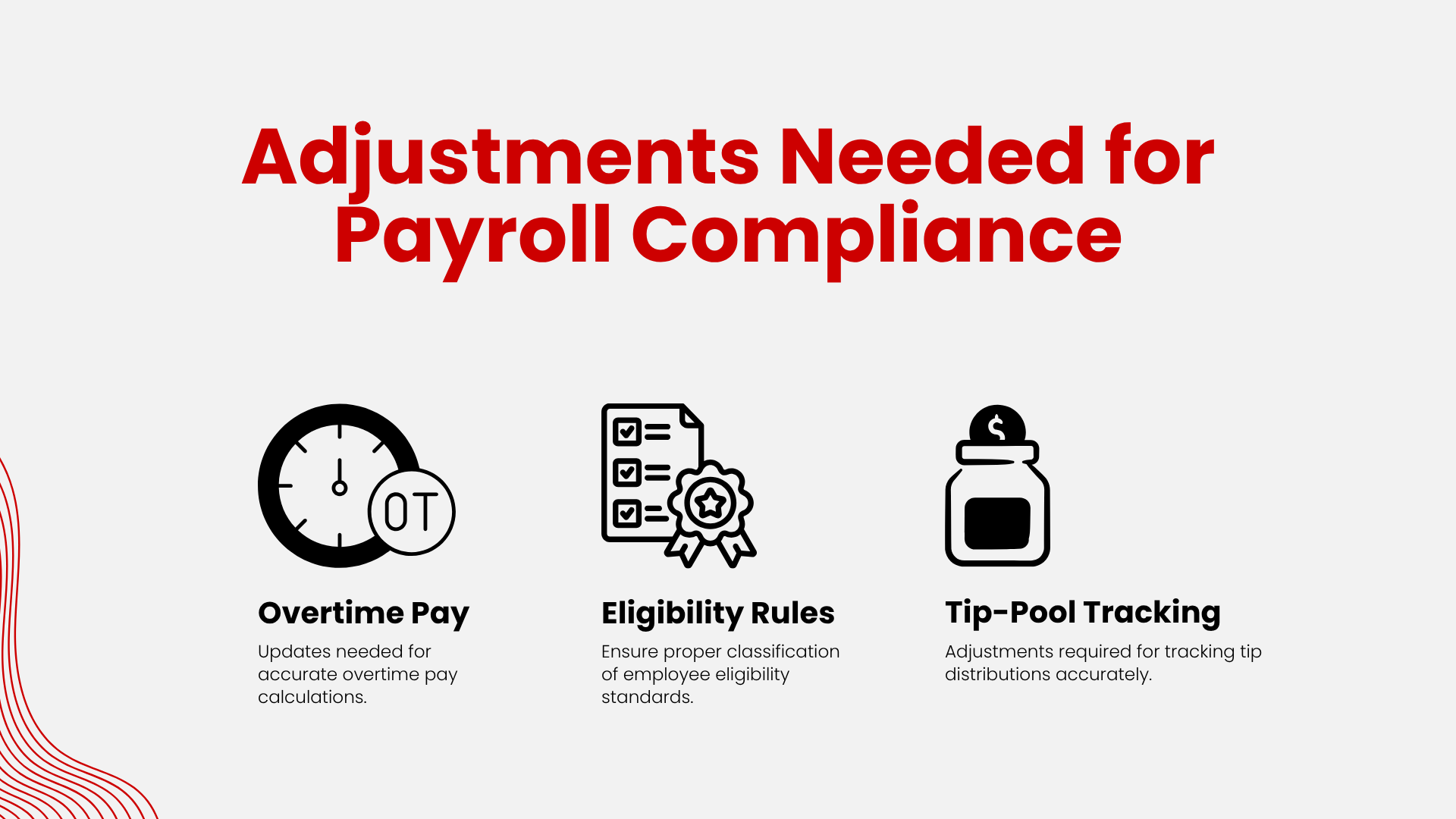 That means your pay-code structure, overtime definitions, tip-pool tracking (if applicable) and classification of employees (eligible vs non-eligible for new exclusions) must be reviewed.