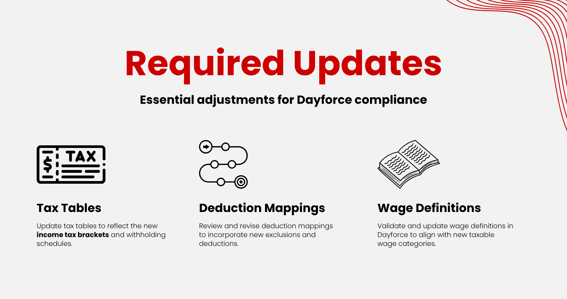 While these updates may seem minor on paper, they alter taxable wage definitions and deduction categories—affecting how Dayforce calculates net pay, manages compliance, and processes reporting.