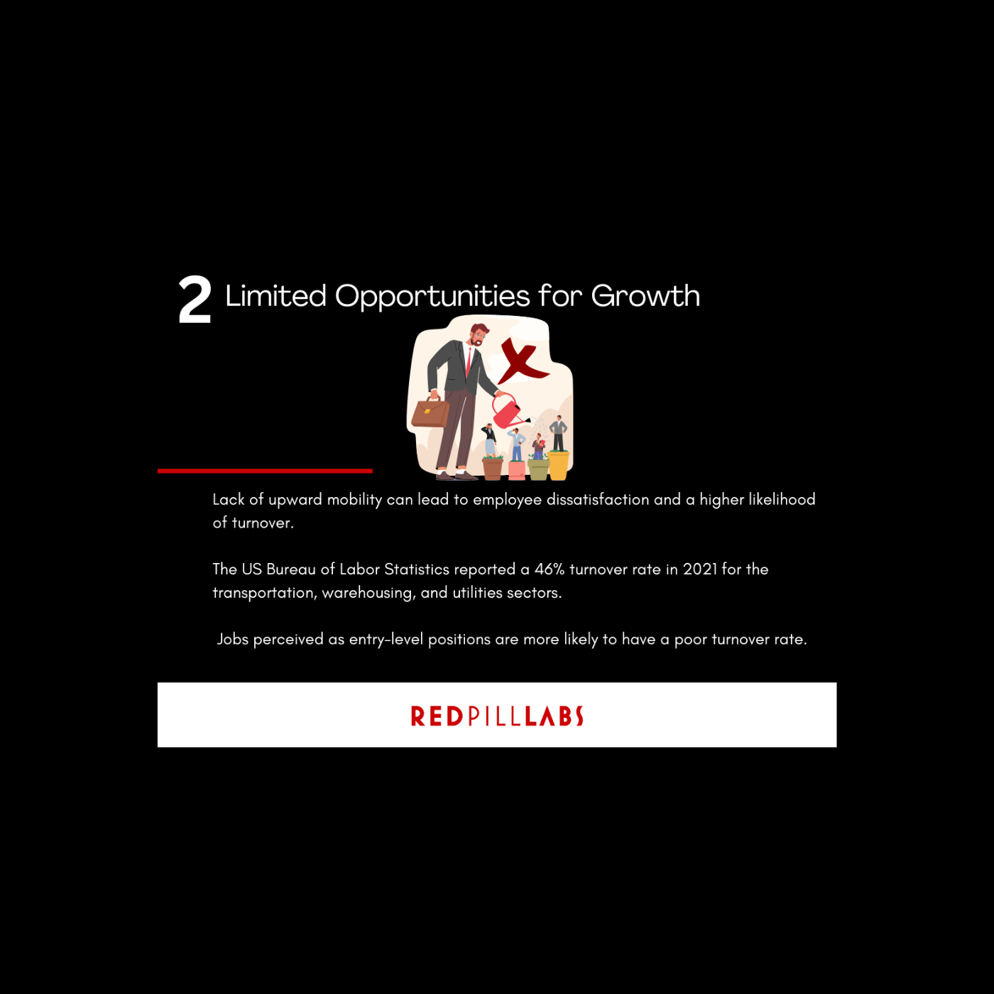 Similarly, industries such as the transportation, warehousing, and utilities sectors can also struggle with limited growth opportunities, with the US Bureau of Labor Statistics reporting a 46% turnover rate in 2021. This can likely be attributed to certain roles within the industries having limited upward mobility. For example, warehouse workers in certain administrative positions may face limited growth opportunities compared to their counterparts in higher-level roles. This disparity can contribute to higher turnover rates within the warehouse industry.